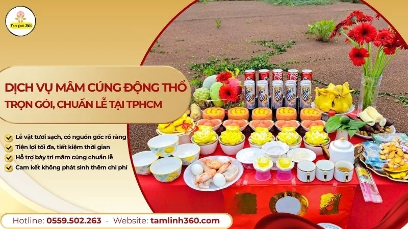 Lễ động thổ (hay lễ khởi công) là nghi thức tối quan trọng để trình báo với Thần linh, Thổ Địa, quyết định đến sự may mắn và vượng khí cho cả công trình. Dịch vụ mâm cúng động thổ trọn gói tại Tâm Linh 360 giúp gia chủ chuẩn bị mâm cúng động thổ xây nhà đầy đủ lễ vật, mâm ngũ quả, xôi chè và bài văn khấn đúng chuẩn phong tục từ khâu sắm lễ, thắp hương cho đến nghi thức cất nóc khi xây nhà, mọi công đoạn đều được thực hiện trang nghiêm, bảo đảm khởi đầu may mắn và vượng khí cho công trình. Hãy liên hệ ngay 0559.502.263 để được tư vấn và đặt mâm cúng chuẩn nhất cho ngày khởi đầu may mắn của bạn!